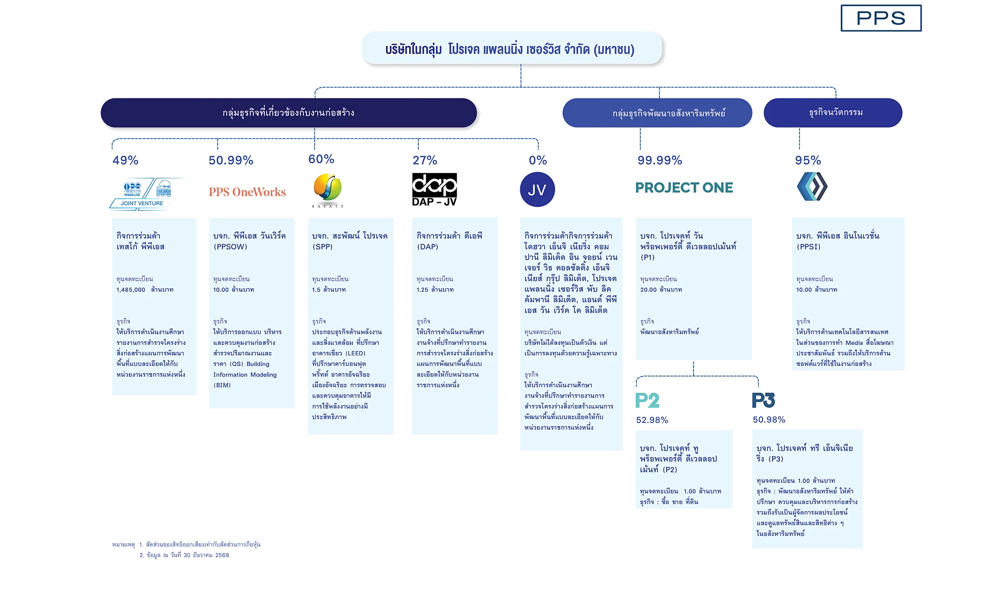 ในปี พ.ศ. 2555 บริษัทฯ ได้เปลี่ยนแปลงโครงสร้างของบริษัทฯ เป็นบริษัทมหาชน และได้ระดมทุนในตลาดหลักทรัพย์ เอ็ม เอ ไอ เพื่อรองรับโอกาสในการเติบโตในอนาคต และเป็นการพัฒนาองค์กรอย่างยั่งยืน หลังการระดมทุนในปี 2555 บริษัท โปรเจค แพลนนิ่ง เซอร์วิส จำกัด (มหาชน) มีพัฒนาการเติบโตอย่างต่อเนื่องทั้งในธุรกิจหลักและธุรกิจอื่นในบริษัทย่อยและบริษัทร่วมทุนของตน เป็นไปตามแผนการพัฒนาขีดความสามารถของบริษัทฯ มิให้จำกัดอยู่เพียงการให้บริการเป็นวิศวกรที่ปรึกษาและบริหารจัดการ โครงการก่อสร้างเท่านั้น ปัจจุบัน บริษัทฯ สามารถให้บริการในด้านต่าง ๆ มากขึ้น ผ่านบริษัทย่อยและบริษัทในเครือต่าง ๆ ประกอบด้วย